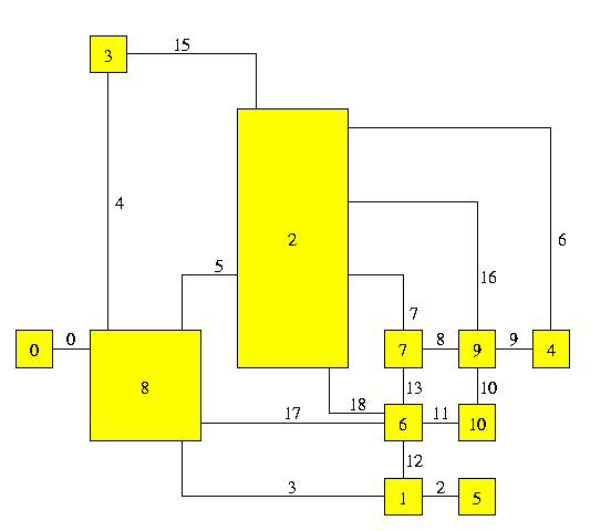 Note: the current version of GDT allows to apply code 4 only to graphs that are biconnected. A graph is biconnected if the removal of one node is not sufficient to cut it into two (or more) disconnected pieces. Note: code 2 causes the invocation of a branch and bound algorithm, that is potentially exponential in time requirement. This makes it unsuitable for graphs with more that 100 nodes. If you need to customize your drawing, then you can exploit the capability of GDT in handling user-specified constraints. For example, if you want that all the nodes of a certain set (say 0, 5, and 6) are drawn in