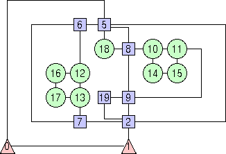 Note: the current version of GDT allows to apply code 8 only to graphs that are biconnected. A graph is biconnected if the removal of one node is not sufficient to cut it into two (or more) disconnected pieces. An example of visibility drawing constructed with the previous steps is shown in the following figure.