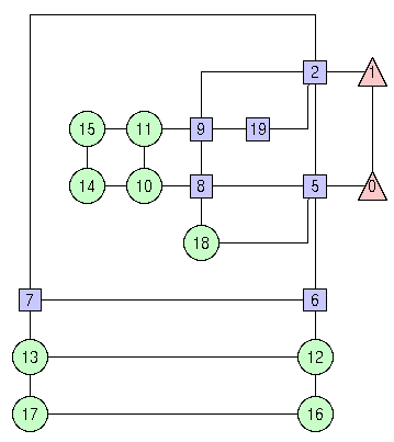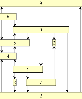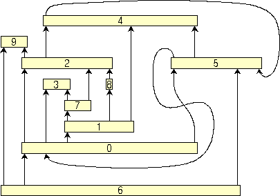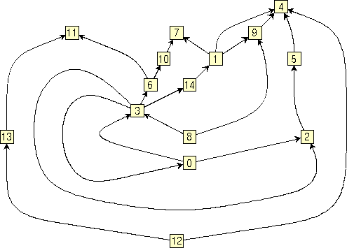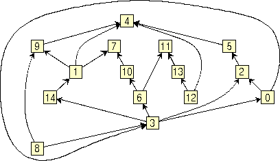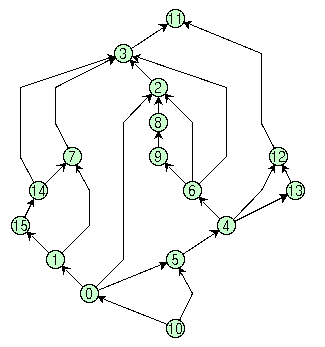 <ALGORITHM> 7 </ALGORITHM> <COMPACTION> 3 </COMPACTION> <END_OPTIONS> Upward drawingsUpward drawings can be used in several applications, for example to draw Petri Nets or SADT diagrams. BLAG considers a more general model of upward drawing, in which some feedback edges are allowed when an upward drawing does not exist for the given graph. We call such a model "quasi-upward" drawing. In a quasi-upward drawing we call "bend" a point in which a feedback edge is tangent to the horizontal line through this point. In what follows we show how to use BLAG for constructing quasi-upward drawings.First, we present a simple strategy, suitable for beginners (but still powerful enough to cover several applications). Second, we describe how to behave if aesthetics are more important than performance. Finally, we show how to customize the drawing according to your special requirements A simple strategy If you want to construct a quasi-upward drawing of a graph with BLAG, simply do the following: